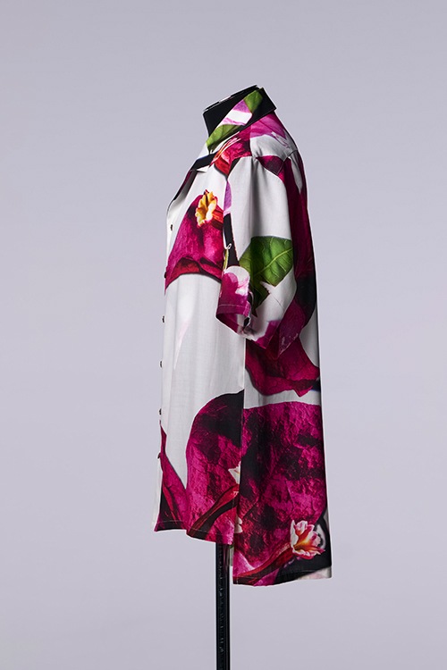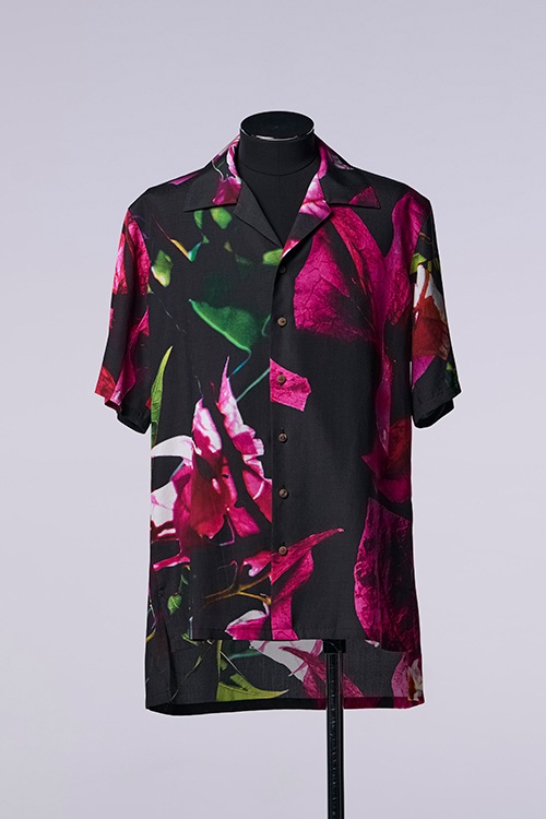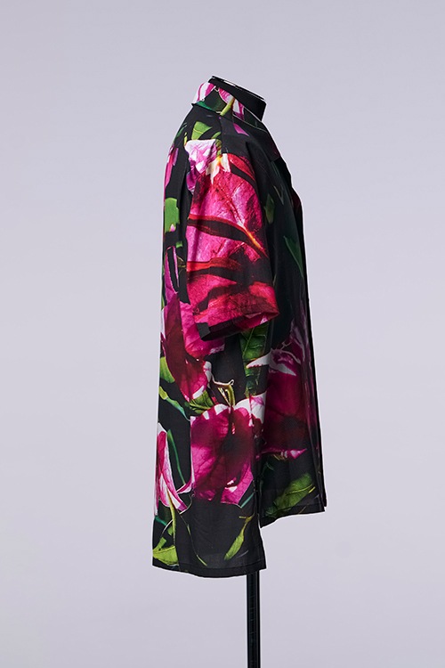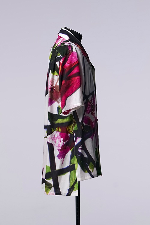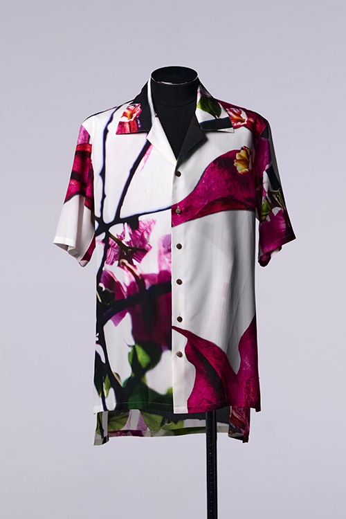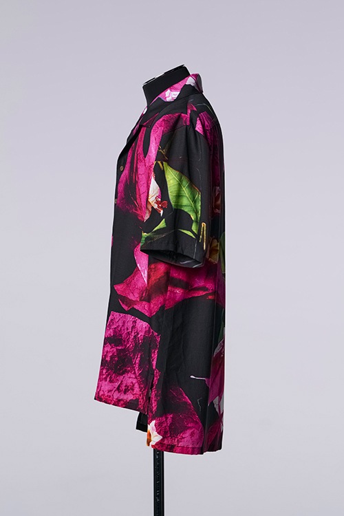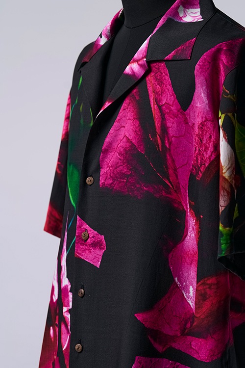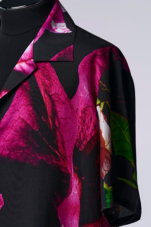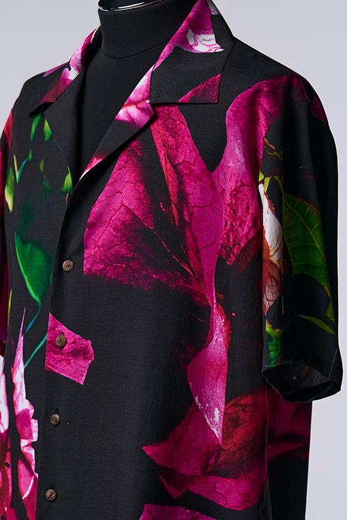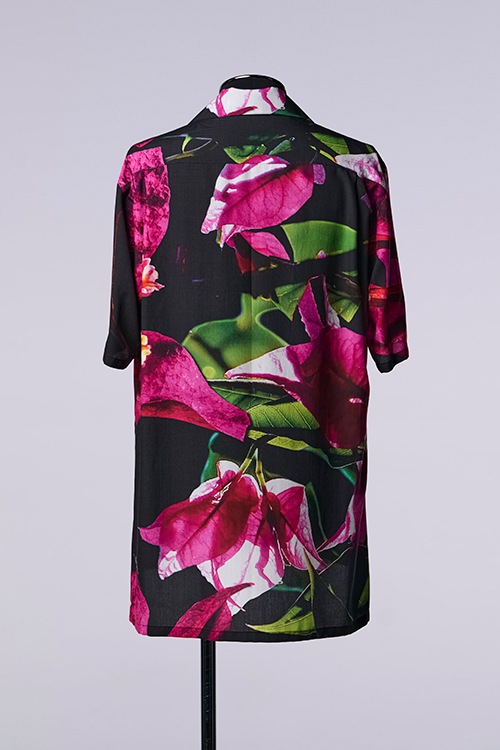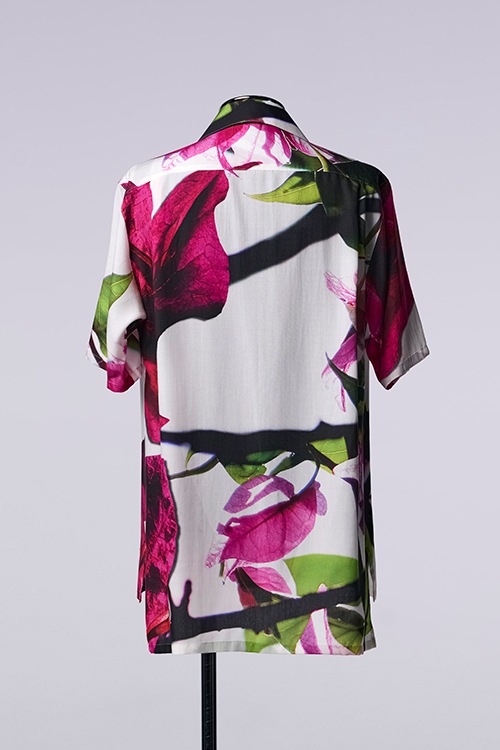 型はシンプルな開襟のブーゲンビリアアロハシャツ。
