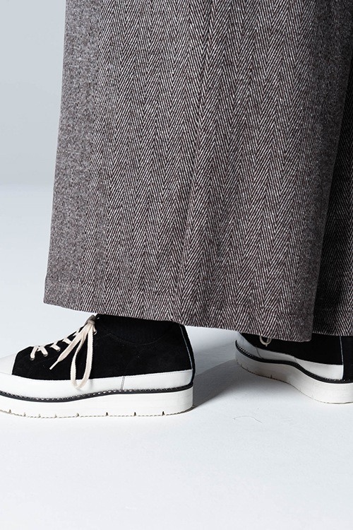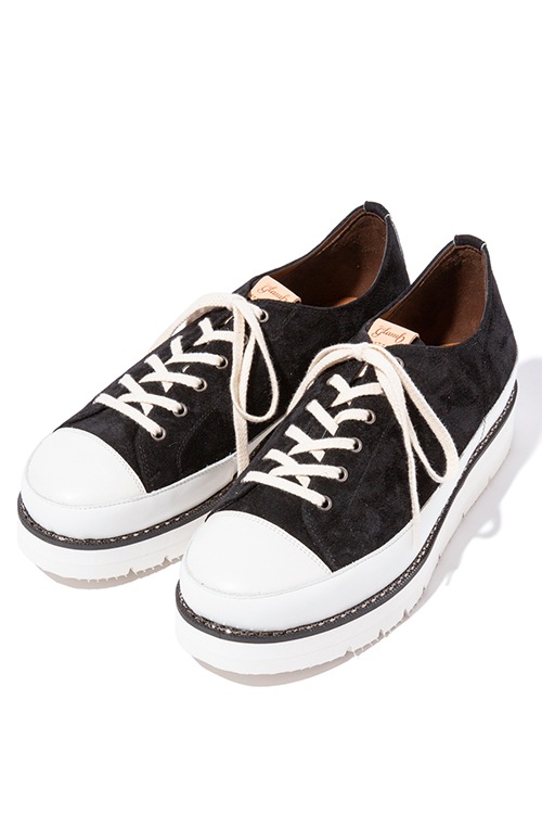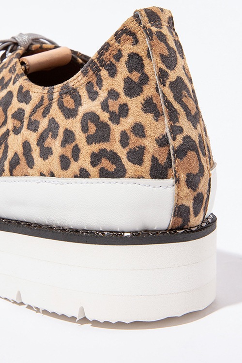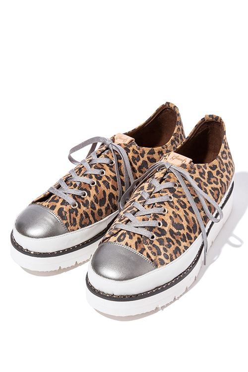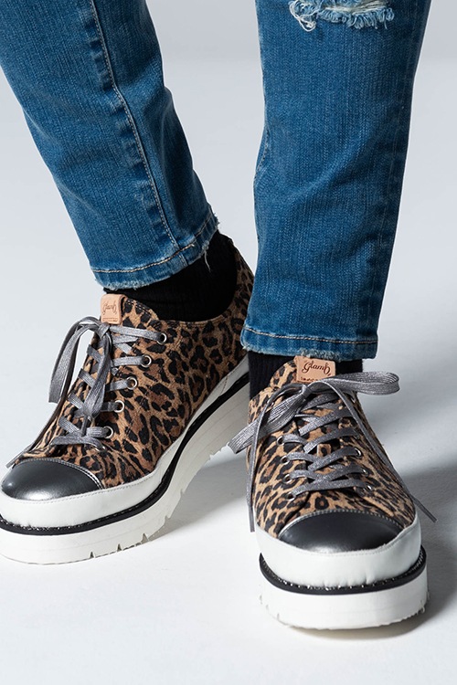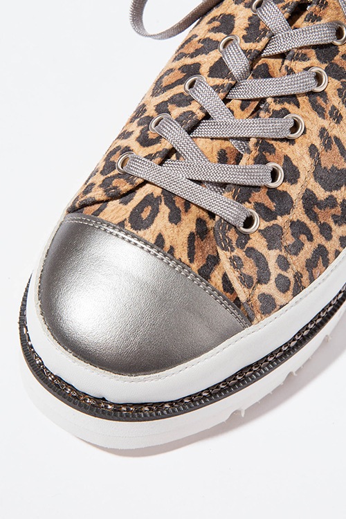 クラシックなスニーカーに、パンキッシュなテイストを織り交ぜたMetal Stitch Sneakers。ボディに選んだマテリアルは、ラグジュアルで手触りが良いピッグスエード。トゥキャップの配色を切り替える事でアクセントとなっています。レオパードはボディ以外のパーツをシルバーにすることでエッジの効いたテイストに。glamb独自のメタルチェーンをあしらったワイドソールでまとめる事で、存在感のある1足です。