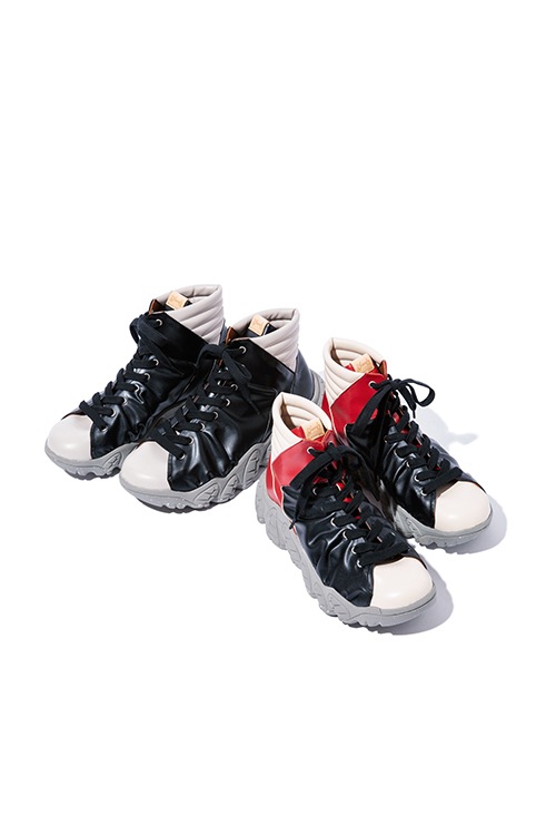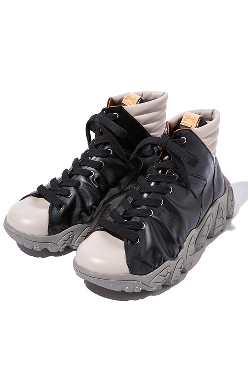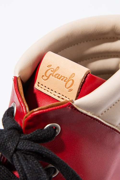 ボクシングシューズを彷彿とさせるマスキュリンなアッパーにコンテンポラリーな変形ソールを組み合わせたDrape Hi-cut Sneakers。シューレース周りに刻まれたドレープは職人が縫製によって丹念に皺出し。細部においても羽根部分のステッチを隠す袋縫いや、履き口のスポンジ縫いなど、職人の力量が発揮される縫い技法が多用されたクラフトマンシップ溢れる仕上がりとなっています。そんなアッパーの表情と並んで個性を放つソールは世界有数のアウトドアソールメーカーであるヴィブラム社製のソールを使用。ハードユースに耐えうるグリップ力と耐摩耗性を兼ね備えたタフなクオリティを確保する一方、ヒール部分にはスポンジを配して歩行性も向上するなど、glambのきめ細やかな作り込みがデザインと機能性の双方に発揮されております。