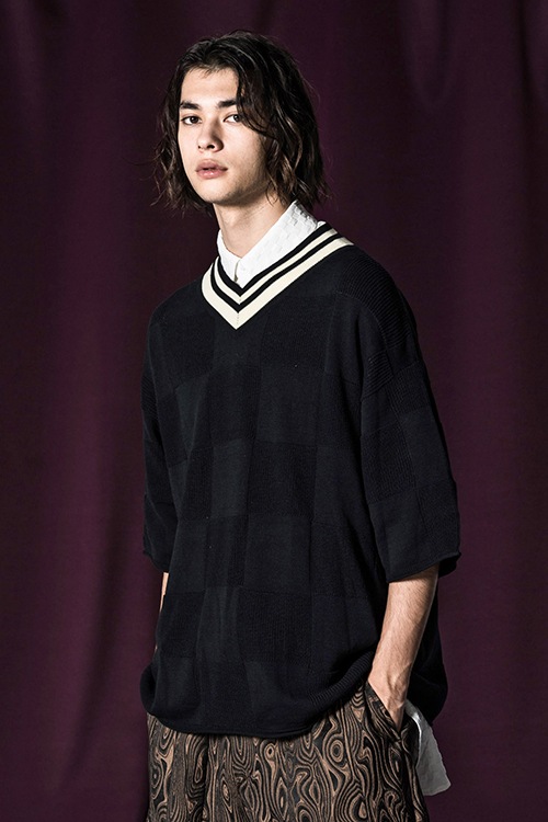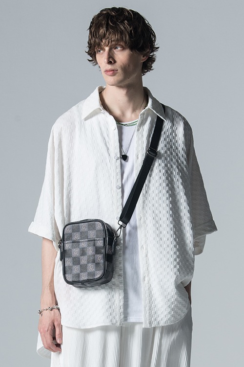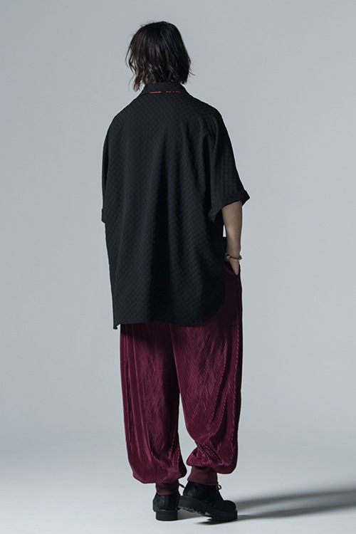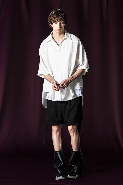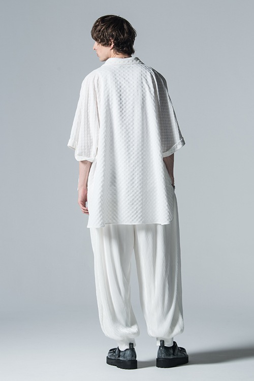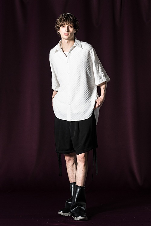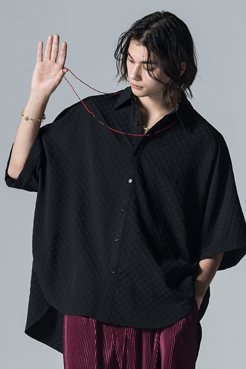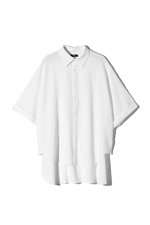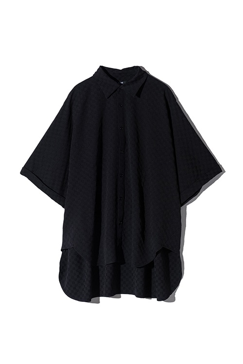 シルエットと素材、シャツを構成する2つの要素にウィットある表現を加えたDolman Half Sleeve Shirts。ドルマンスリーブとなったボディは身幅にゆとりをもたせたオーバーサイズ。着丈に前後差をつけた裾部分にはマチを加えることで立体感を演出、エアリーな佇まいにまとめています。その佇まいに呼応させるようブランドが落とし込んだのがふくれジャガードによるチェッカー柄生地。軽さある素材ながら凸部分はよく見ると2種のテクスチャを備え、シルエットにより一層の陰影を与えます。