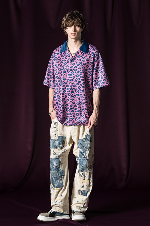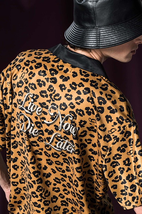 ボウリングシャツの持つロカビリーやオールディーズといったムードをヴィヴィッドに際立たせたLeopard Bowling Shirts。身頃の生地はブランドイニシャルの“g”を隠し込んだオリジナルレオパード。上衿はコントラストある配色を、後ろ身頃には影を付けた3D表現でメッセージをあしらった50’s的な明るさも現代のストリートでは一転して尖った佇まいを生み出します。シルエットは身幅広め、袖丈もやや長めに取ったオーバーサイズシルエット。落ち感のある素材感はボトムスにインしてもアウトしてもバランスよくご着用いただけます。