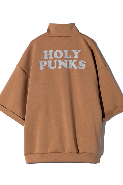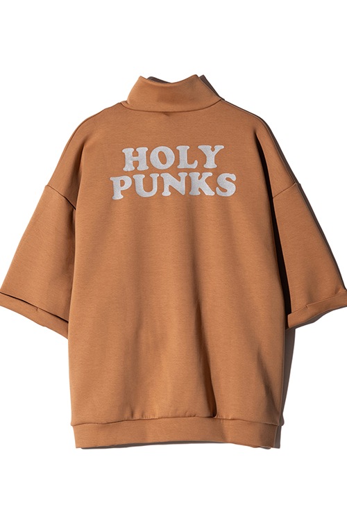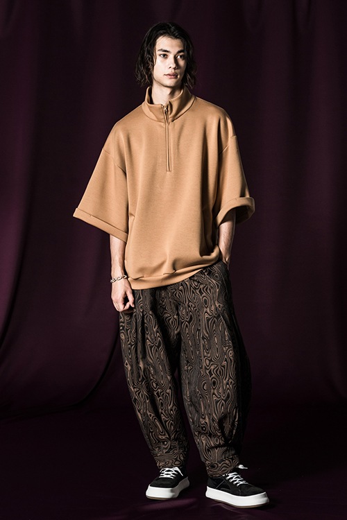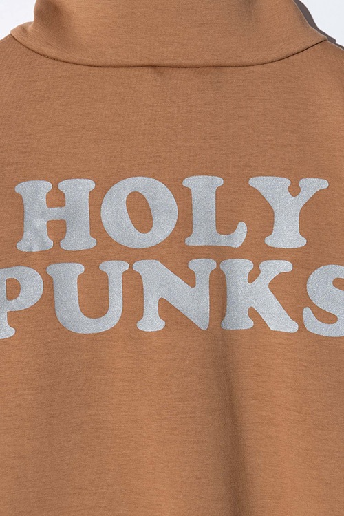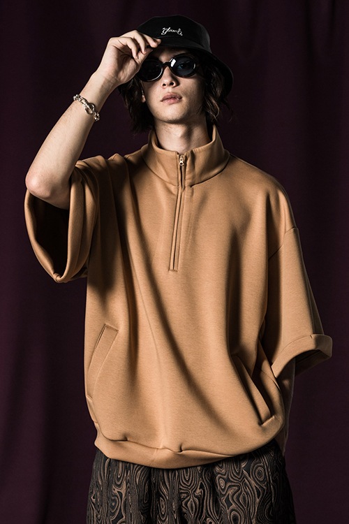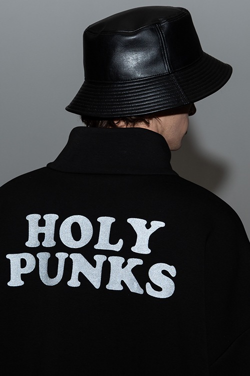glambの奔放なイマジネーションがカジュアルウェアをラグジュアリーに昇華するHi Neck Zip Jersey。テキスタイルには軽量性と保温性に優れるダンボールニットを使用。上品な光沢とハリ感を備えたソリッドなテクスチャに、知的なハイネックとオントレンドなハーフジップを掛け合わせることでストリートスタイルにリュクスなニュアンスがもたらされます。バックスタイルでは今季のテーマ“Holy Punks”をリフレクタープリントでロゴ使いし、機能性とデザインが一つとなったハイブリッドな佇まいに。ビッグシルエットのボディは五分袖に設定しており、単体使いはもちろんロンTを重ね着したりと気温に応じたスタイリングアレンジでシーズンレスに活躍します。