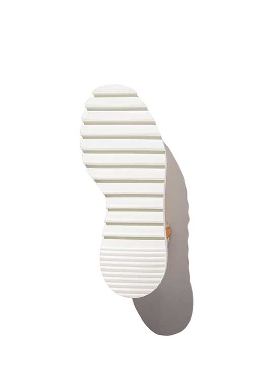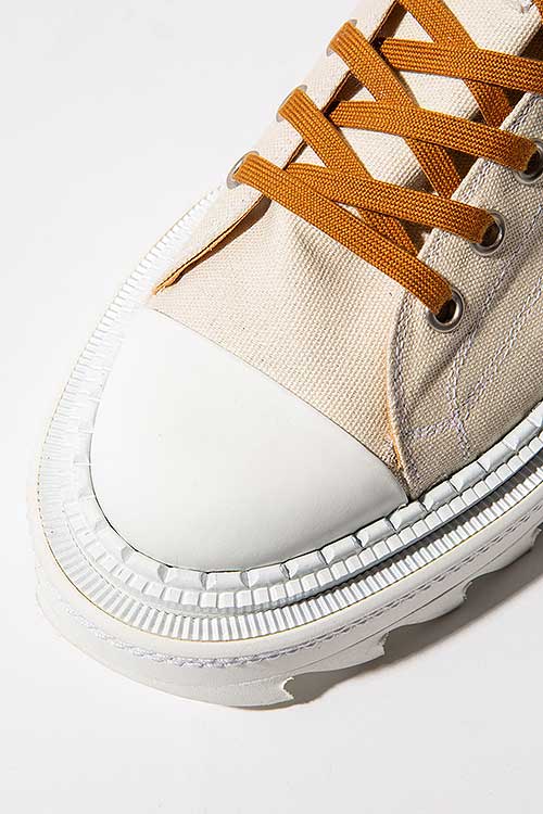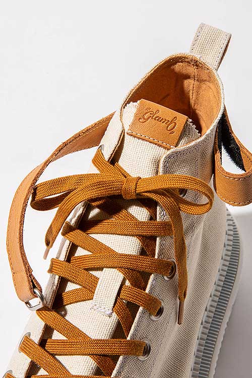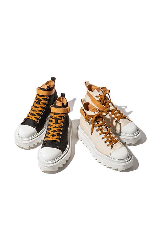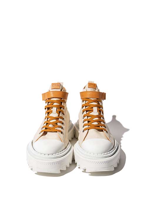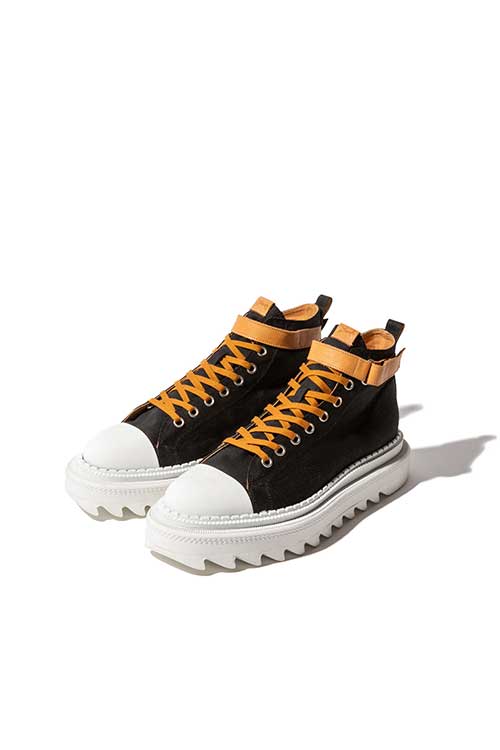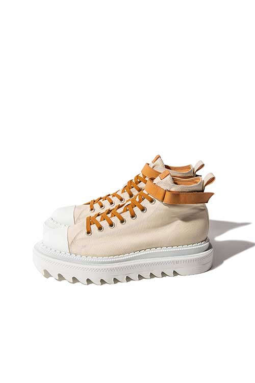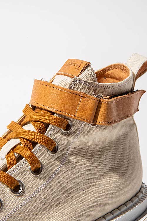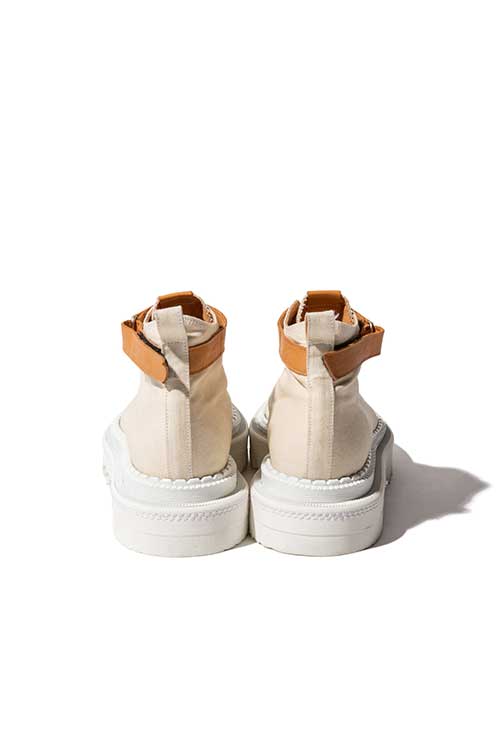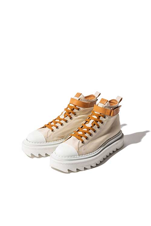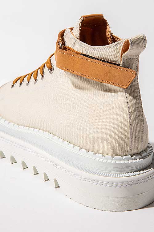 オーセンティックなハイカットスニーカーをglambの感性でアレンジ、フットウェアの選択肢としてあらためて提案するShark Sole Canvas Sneakers。8アイレットのアッパーに新たな表情をもたらすのは履き口にあしらわれたベルクロ仕様のベルトパーツ。素材にはヌメ革を用いており、ラグジュアリーなアクセントとなると共に使い込むごとに育つ経年変化も魅力となっています。シューレースはベルトと同系色のブラウンカラーで配色。色使いからアダルトなモダンストリートの息吹を吹き込みます。二段の押し縁を施した重厚なソールはEVAとパンキッシュなシャークソールのダブルソール。4のスタイルアップを実現しながら、抜群のグリップ力とクッション性の高い上質な履き心地をもたらします。