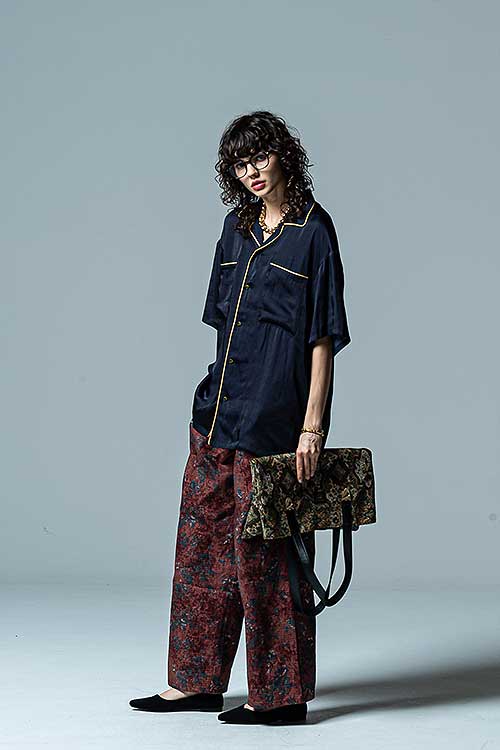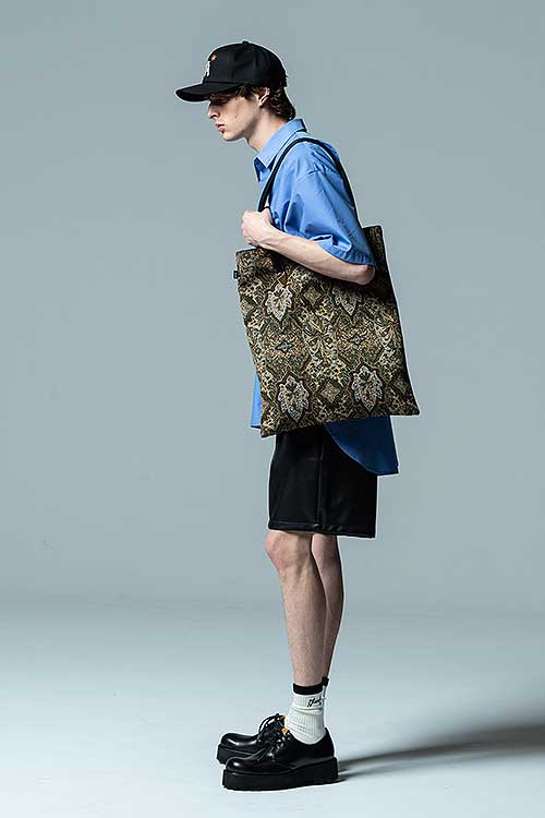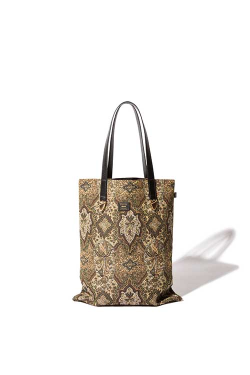 英国リバティー社製のゴブラン生地を贅沢に用いたGobelin Tote Bag。A3サイズも余裕を持って収納できるボディは、高級感のある柄使いでスタイルをラグジュアリーに演出。大きめに設けたレザーの持ち手は袖幅のあるトップスを着用の際にもストレス無く肩掛けしていただけます。持ち手の先端にはメタルパーツを配し、ロックなアクセントを添えました。