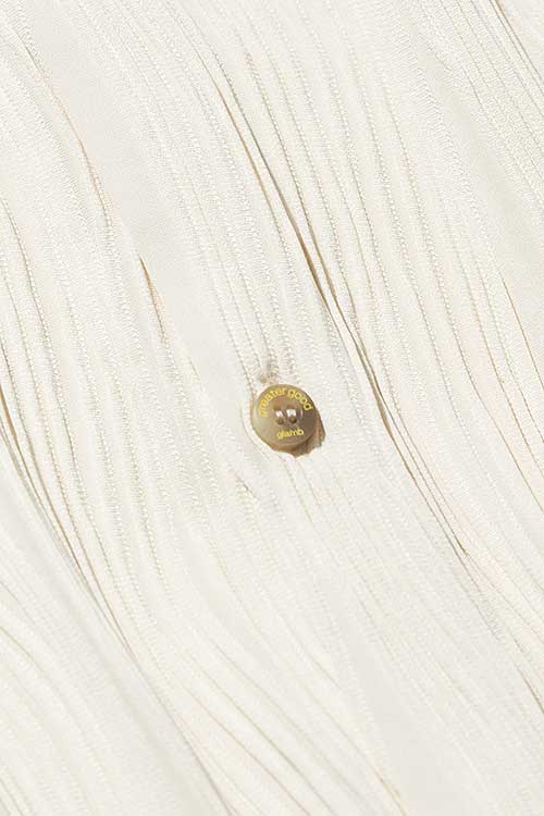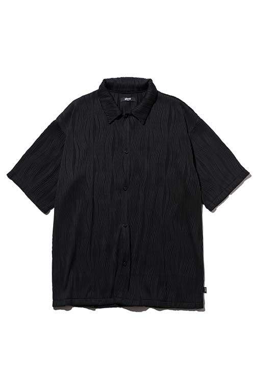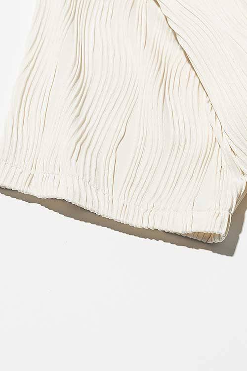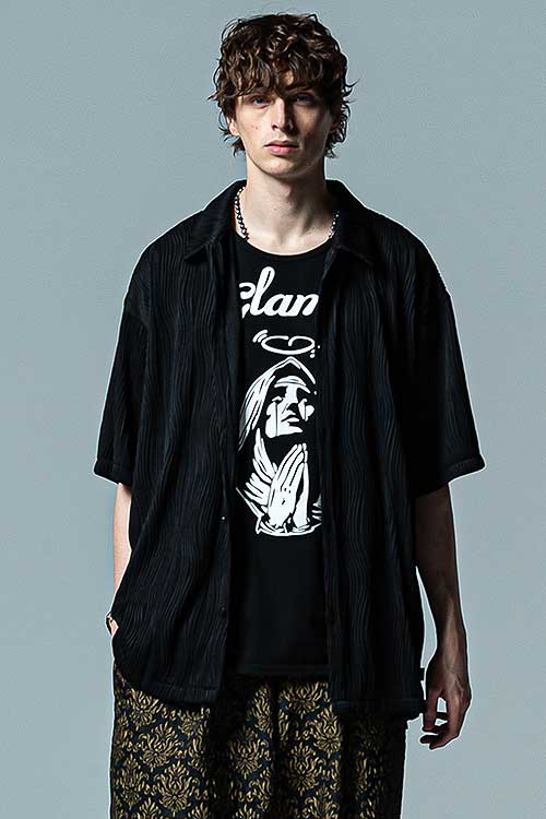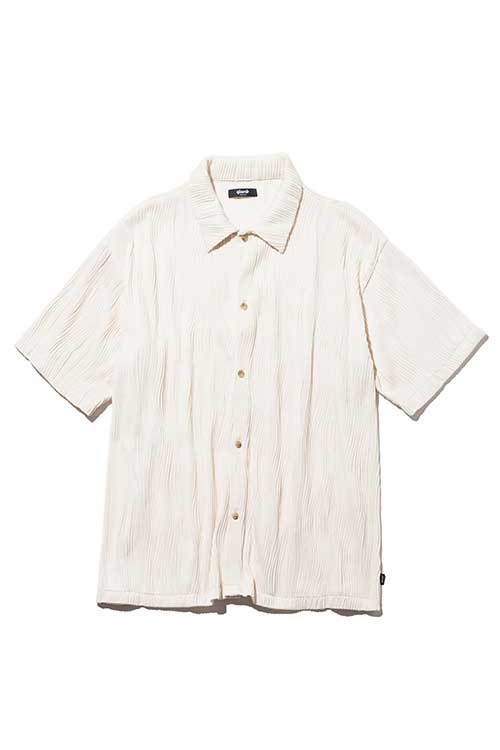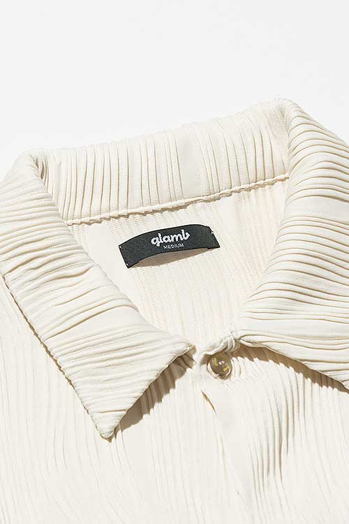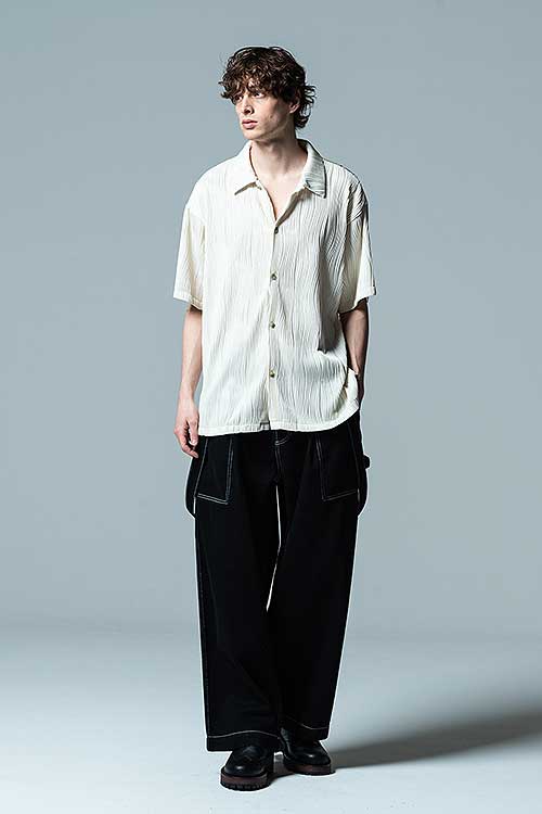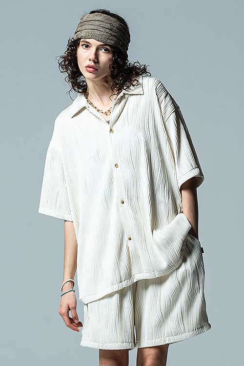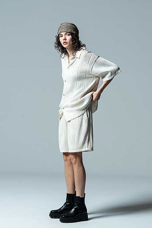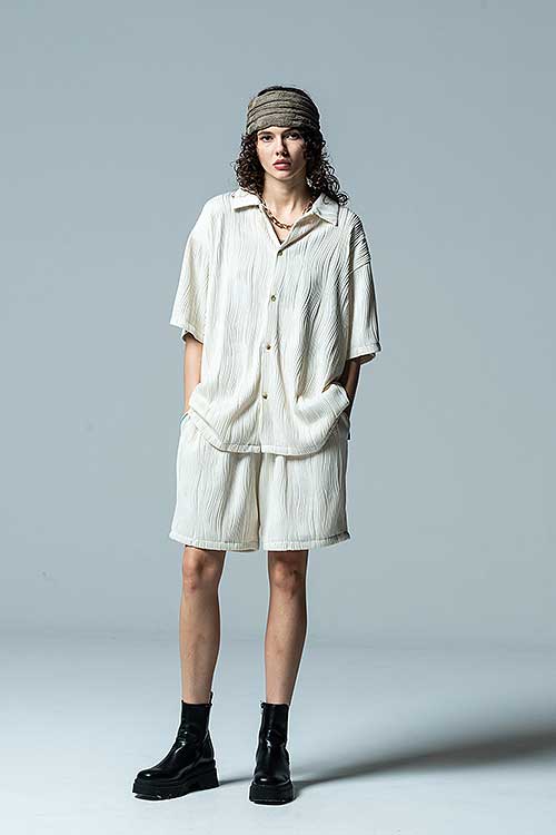 流麗な素材使いによってモードとリラックスが相まった佇まいを作り上げるOpen Collar Glamour Shirts。オーバーサイズの開襟シャツに落とし込まれたのは、流線形のタックが刻まれたイージー素材。編み針で網目を作り、さらに編みを介して編み地に結び付けるという丹念な工程によって畝を表現した特殊なテキスタイルとなっています。今季は同素材を使用したショーツ、Glamour Shortsも合わせて展開。タウンユースからリゾートシーンでも活躍するセットアップスタイルも提案します。