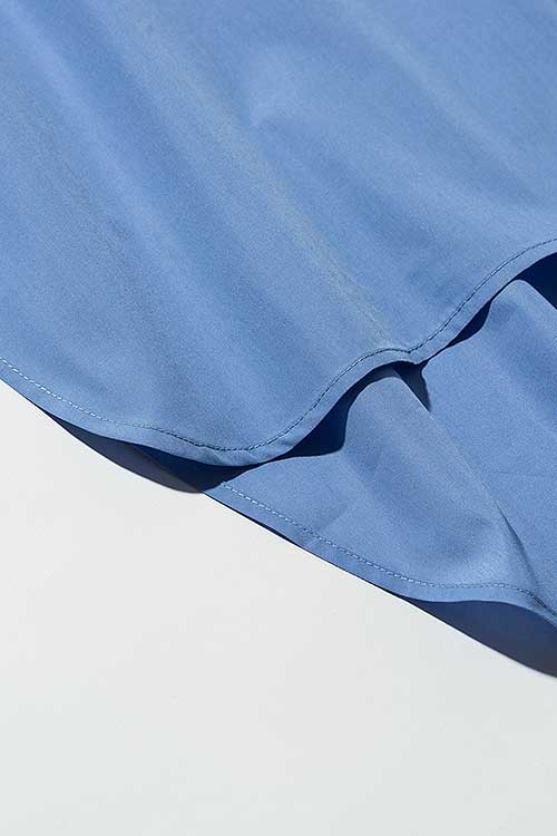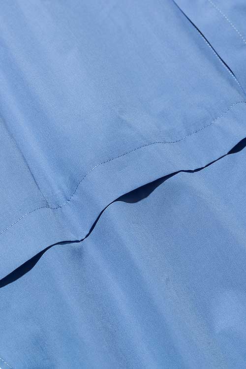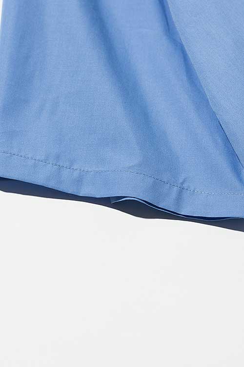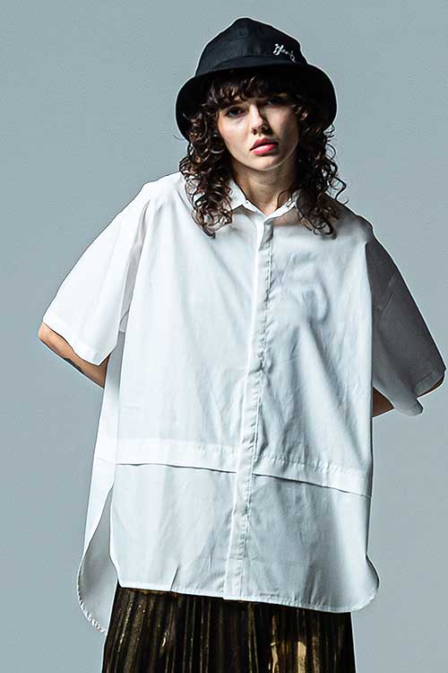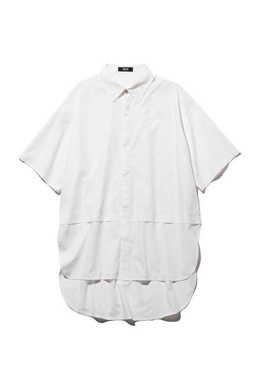 ドレスシャツのフレームワークを残しながら、そこにglambならではの意匠を散りばめることで真新しいムードを作り上げたHem Layered SH。身幅とアームにゆとりを持たせたオーバーサイズのボディはウエスト部分をフェイクレイヤード。2枚のシャツを重ねたかの佇まいは身頃に前後差を付けることで独創性をより強めます。その輪郭を強調するように前身頃のボタンは比翼隠し。代わりにさりげないアクセントとして身頃同系色の刺繍によってブランドロゴをあしらうなど、ディテールの上品な押し引きも本作のこだわりです。