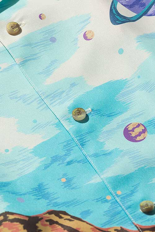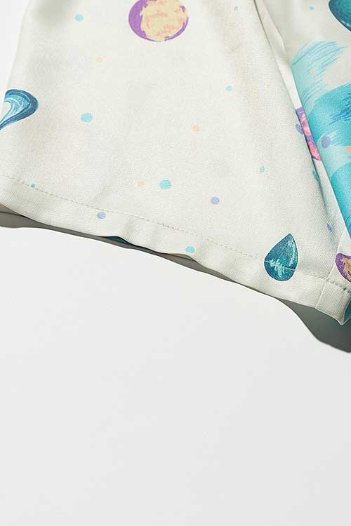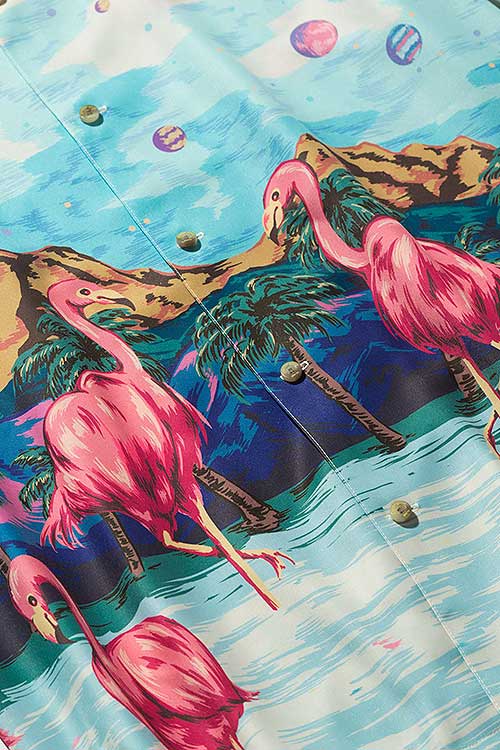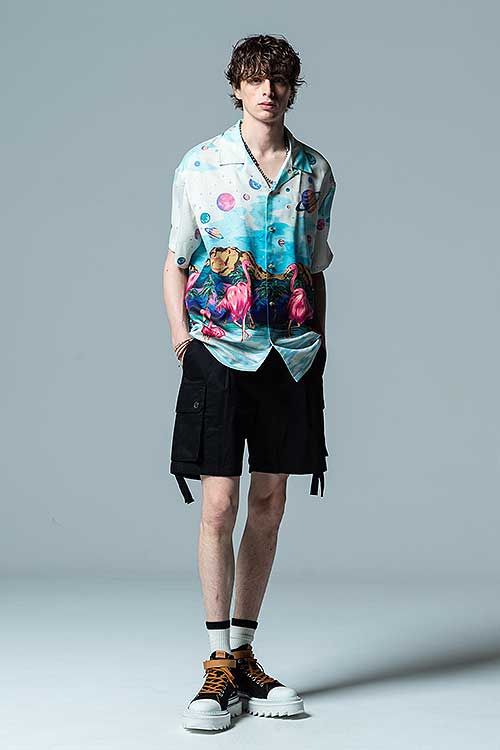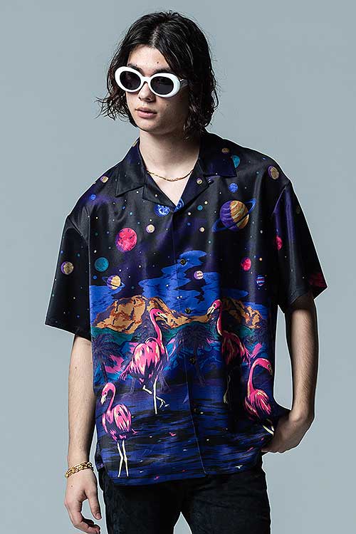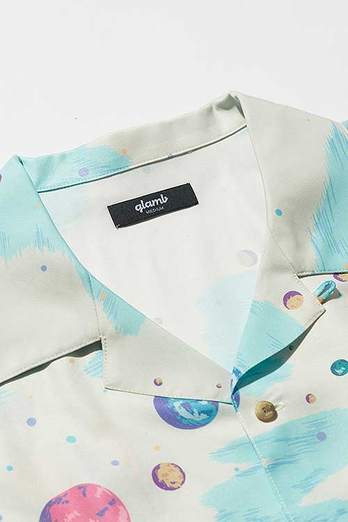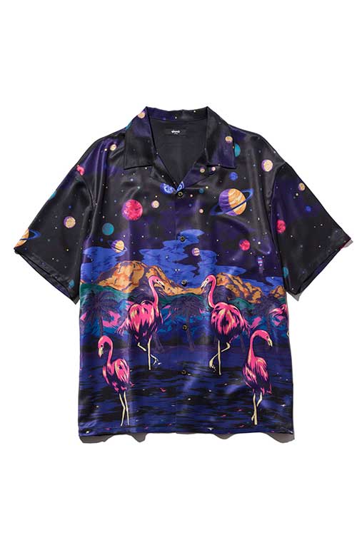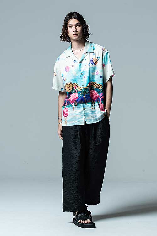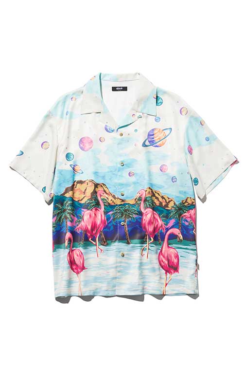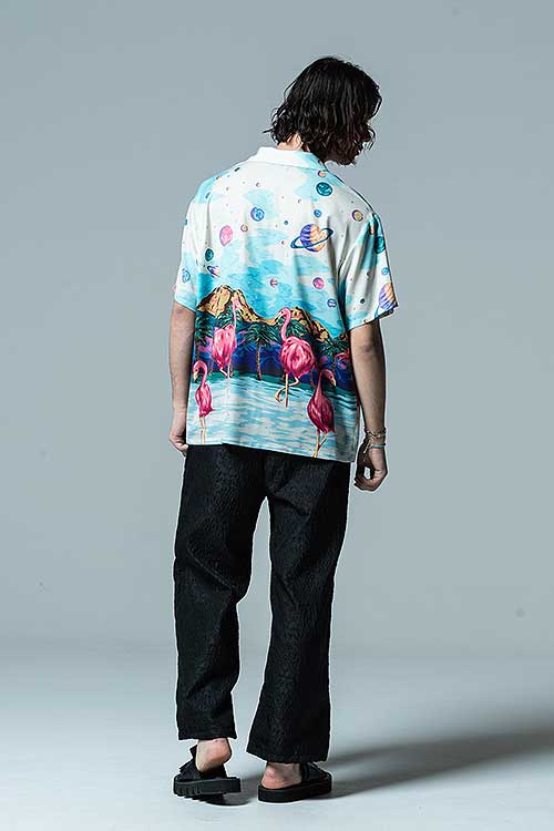 ブランド20周年となる今年、2021年夏のコレクションで好評を博したParadise island SHが驚きの進化を遂げたParadise Cosmic SHとなって登場。身頃の前後に描かれたフラミンゴはそのままながら、変貌を見せるのはその背景。南国の水辺を描いていた前作に対して今作で描かれるのは宇宙空間。glambならではのウィットあるデザインの奥に、留まることなく進み続けるブランドのアティチュードを込めました。テキスタイルにはレーヨンライクな質感を持った素材をセレクト。ボディはレギュラーシルエットだった前作からオーバーサイズにシルエットを変更し、昨今のスタイリングのニーズに応じるアップデートを施しています。