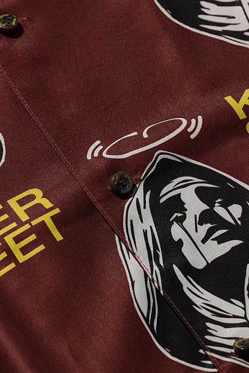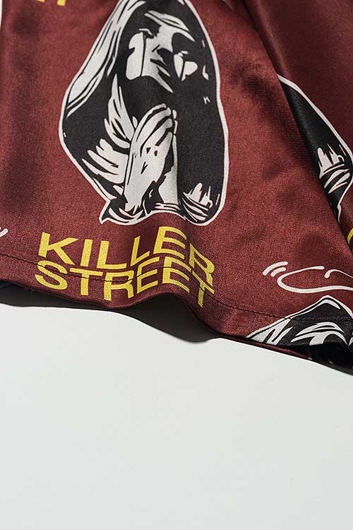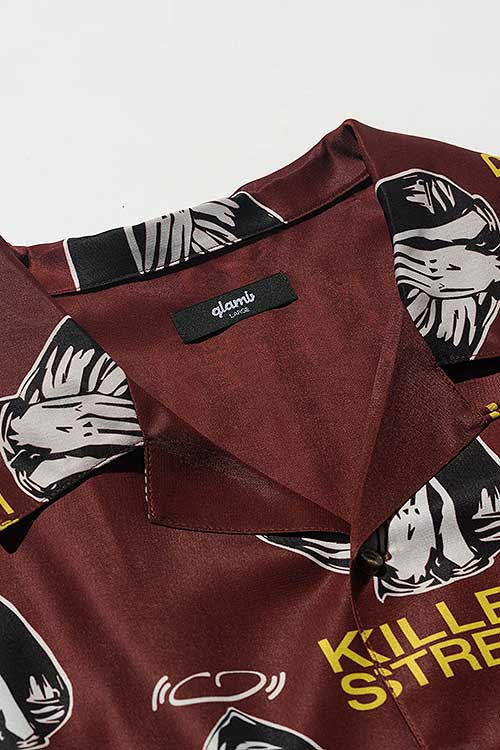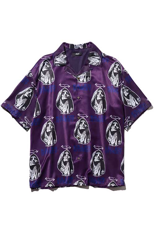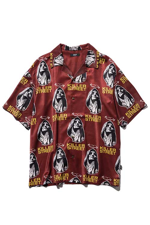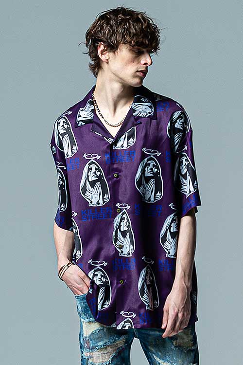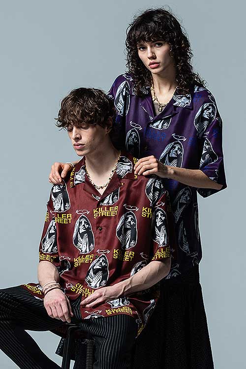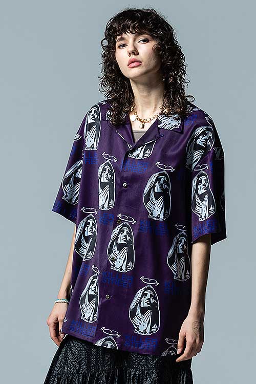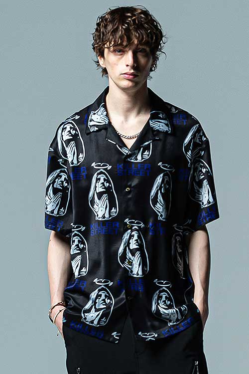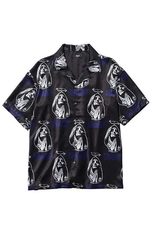 glambがブランド黎明期から繰り返し用いる宗教画的なモチーフをヴィヴィッドな総柄に落とし込んだOpen Collar Prayer SH。オープンカラータイプのボディにあしられたのは祈りを捧げる聖母の姿。その間を縫うように今季のコレクションテーマ“Killer Street”の文字を散りばめ、神秘性とパンクテイストを大胆に同居させています。テキスタイルはレーヨンタッチの落ち感ある素材を使用。オーバーサイズのボディはシャツイン、アウトを問わずルードでレイジーなスタイリングを形作ります。