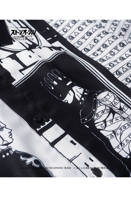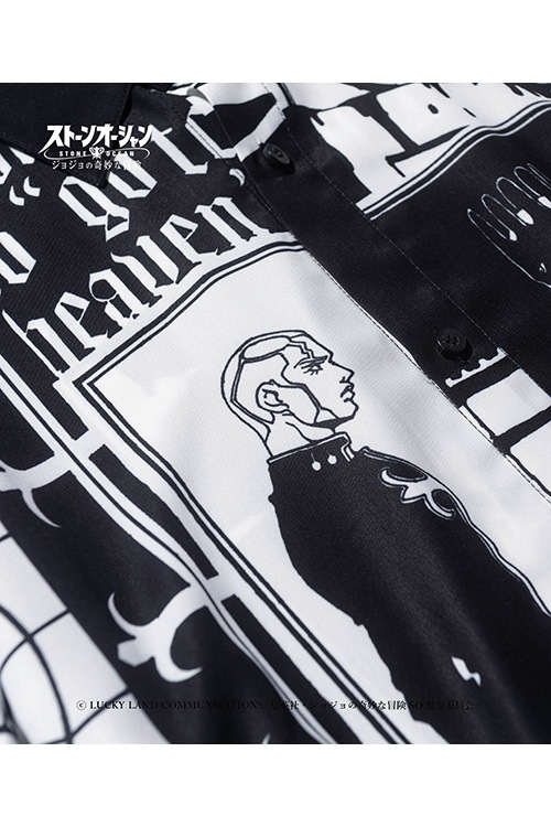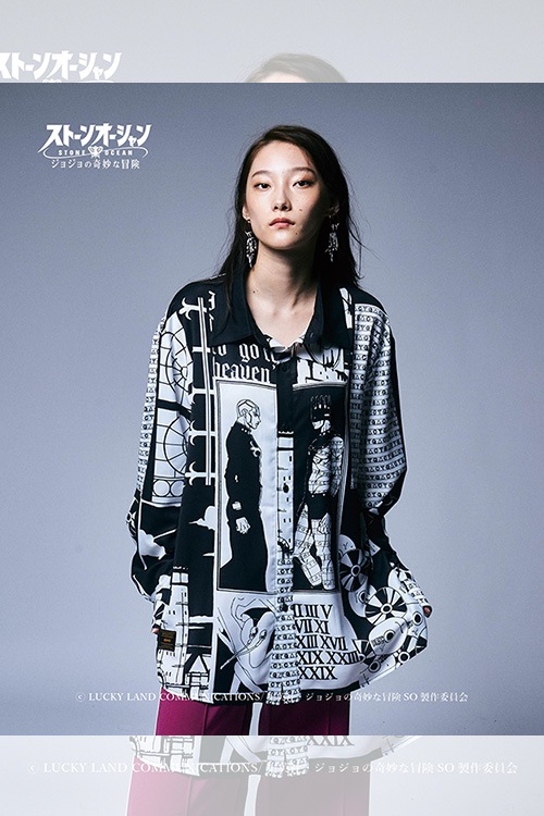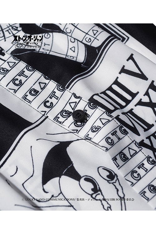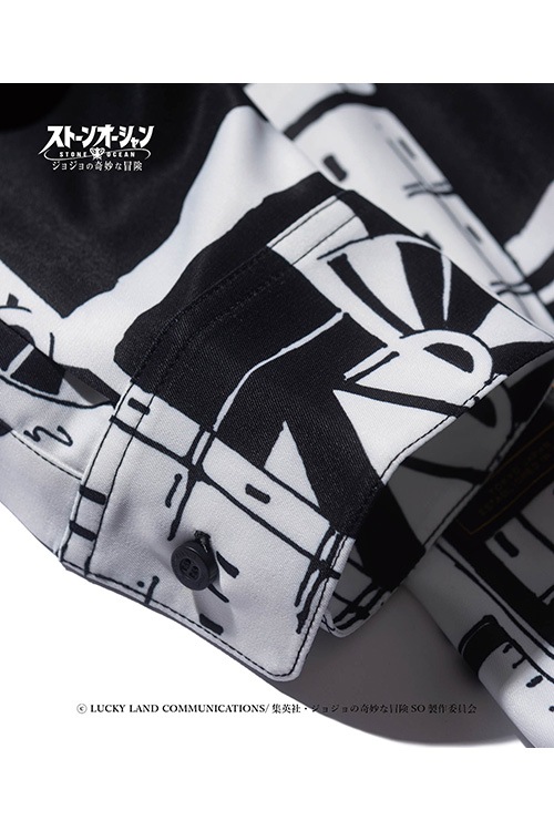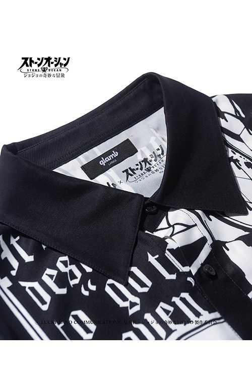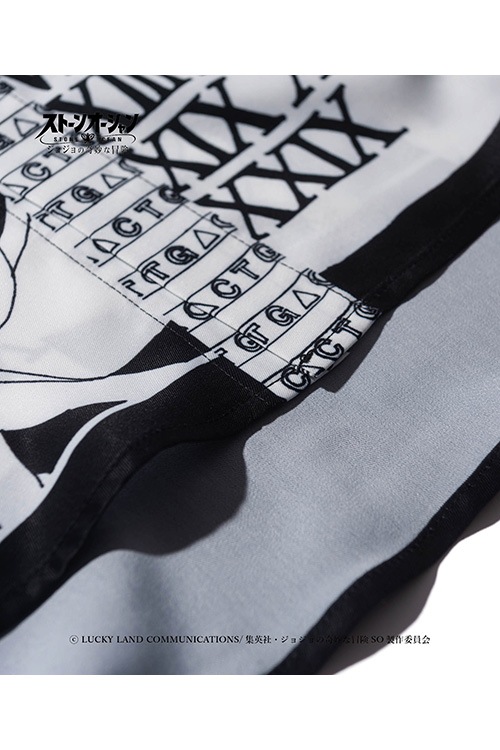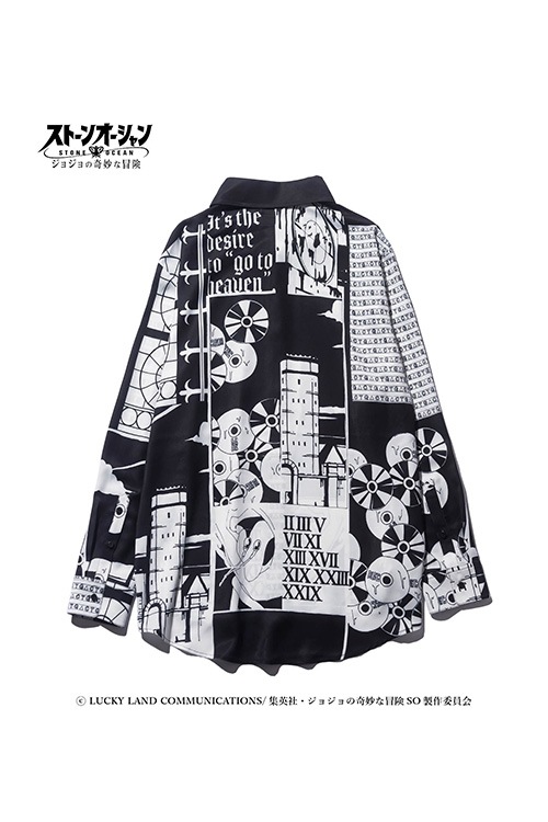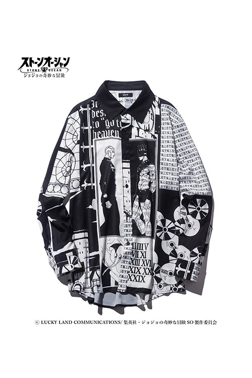 作中の宿敵として登場するエンリコ・プッチの佇まいをボディ全体で荘厳に表現したEnrico・P SH。描画技法には優雅で装飾的なアール・ヌーヴォーの様式を取り入れながら、総柄の隅々に描かれたのはディスクや文字列といった無機質的なモチーフ。どこか不穏なそのバランスは作中におけるプッチの恐ろしさを思い起こさせます。